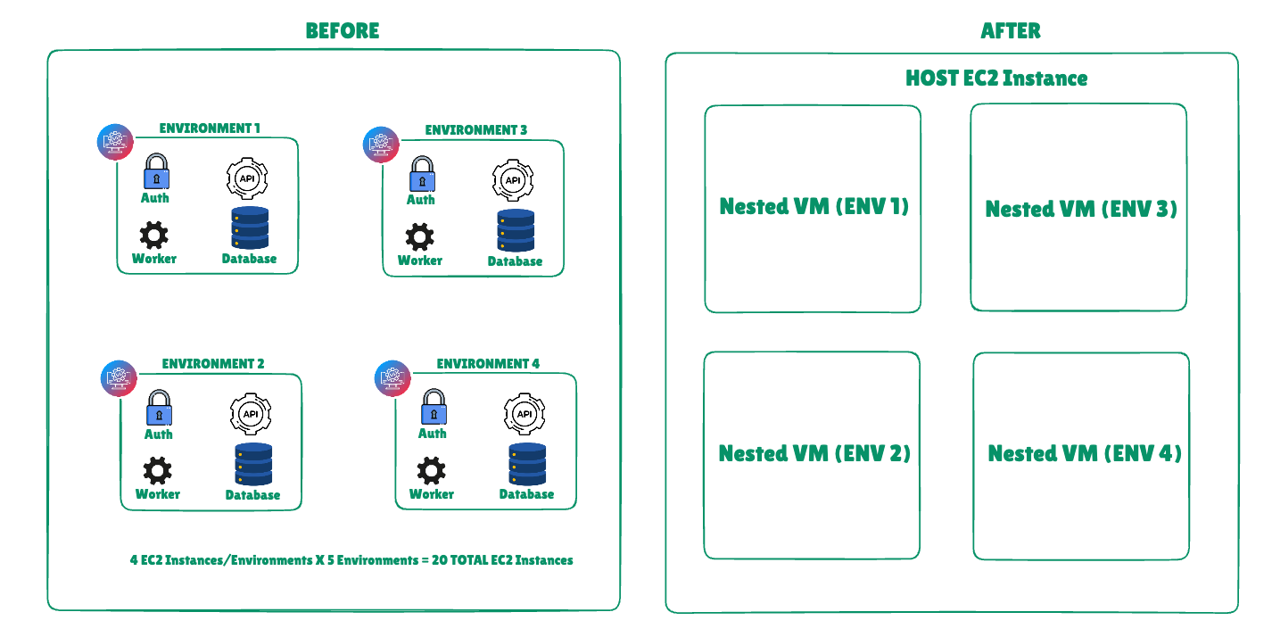 Before this change, if you wanted strong isolation guarantees for testing or pre-production validation, you’d typically provision separate EC2 instances per environment. For something moderately complex — say auth, API, worker, and database — you’re easily looking at four instances per environment.